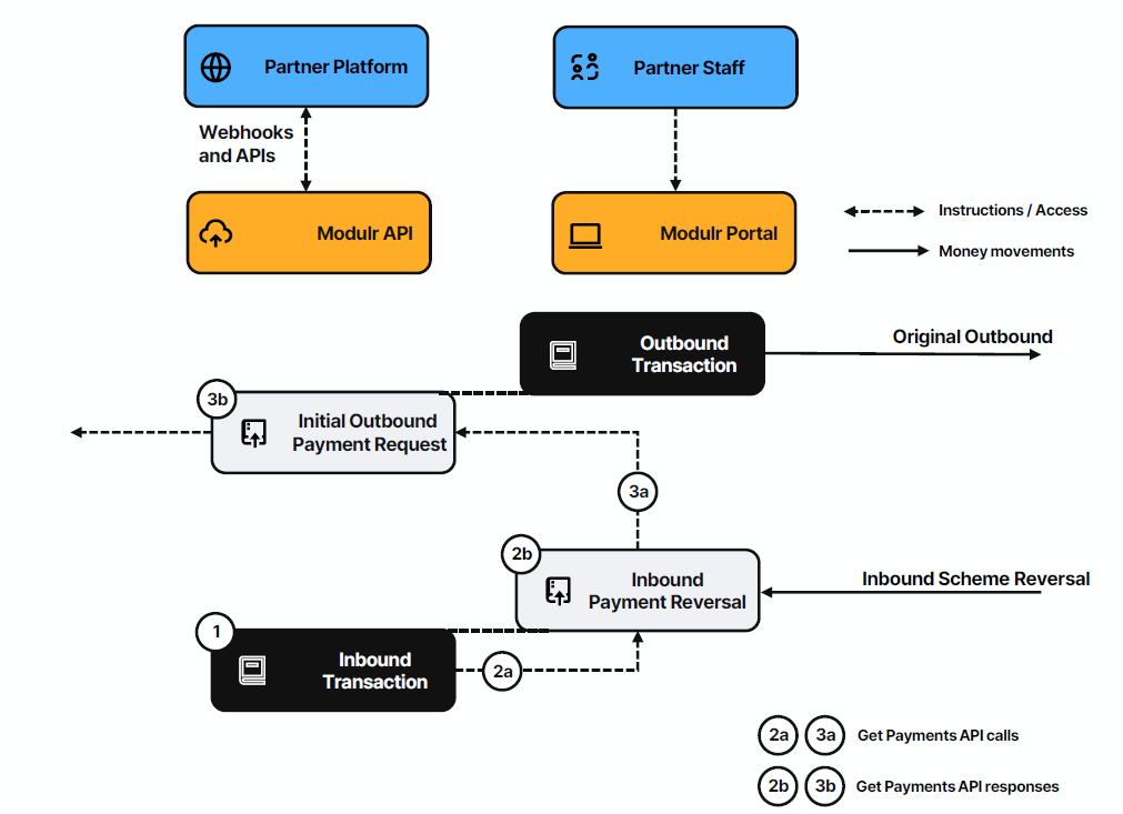 - A Get Transactions API response will identify a PO_REV in “type”, extract the “sourceId”. This is the Modulr Payment Reference (PBID) for the scheme inbound reversal.
